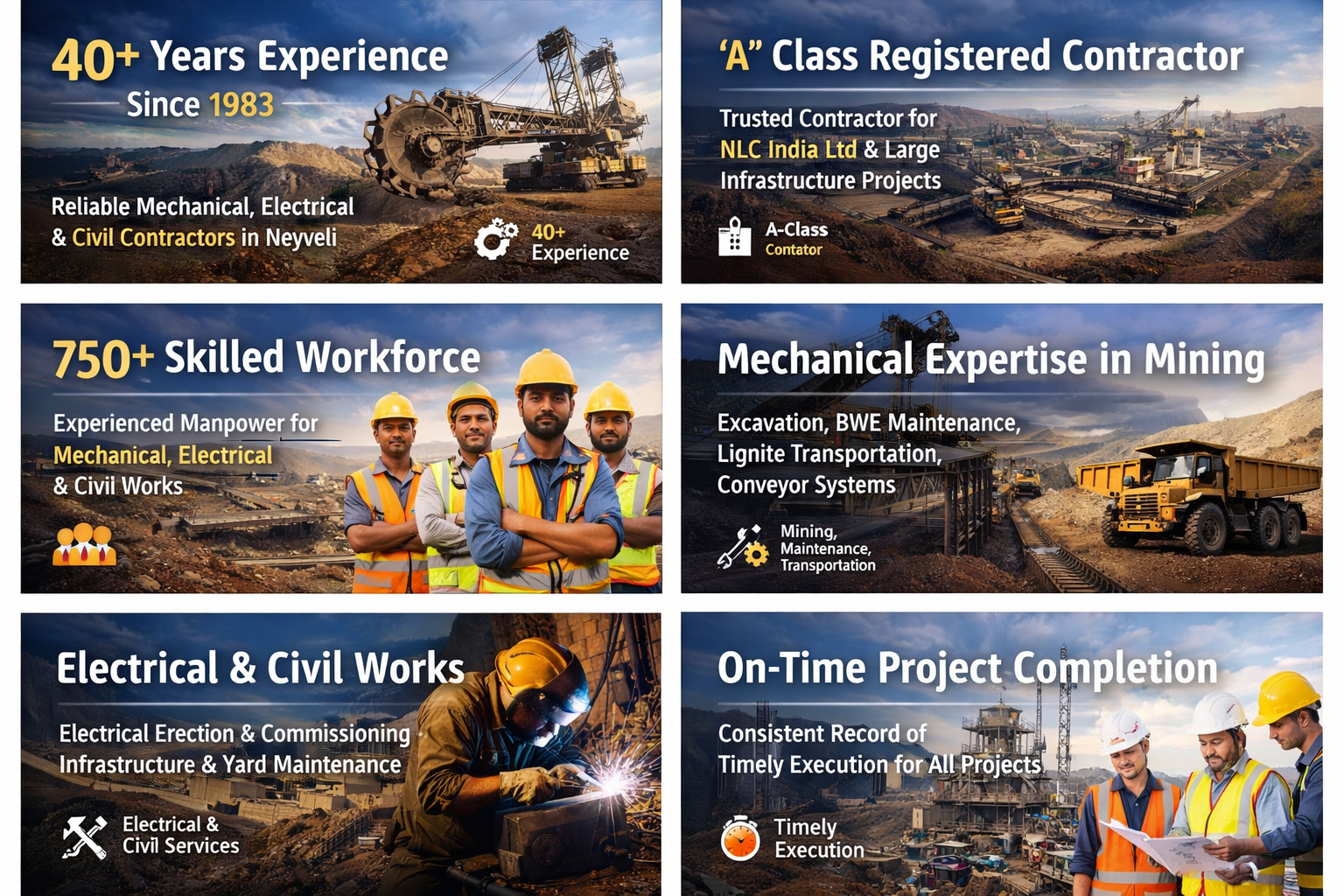 S. Thamizhmani is a reputed proprietorship concern established in 1983, specializing in Mechanical, Electrical, Civil, Transportation, and Maintenance works. We have been executing major contracts at NLC India Limited, Neyveli with a strong workforce of 750+ skilled labourers.